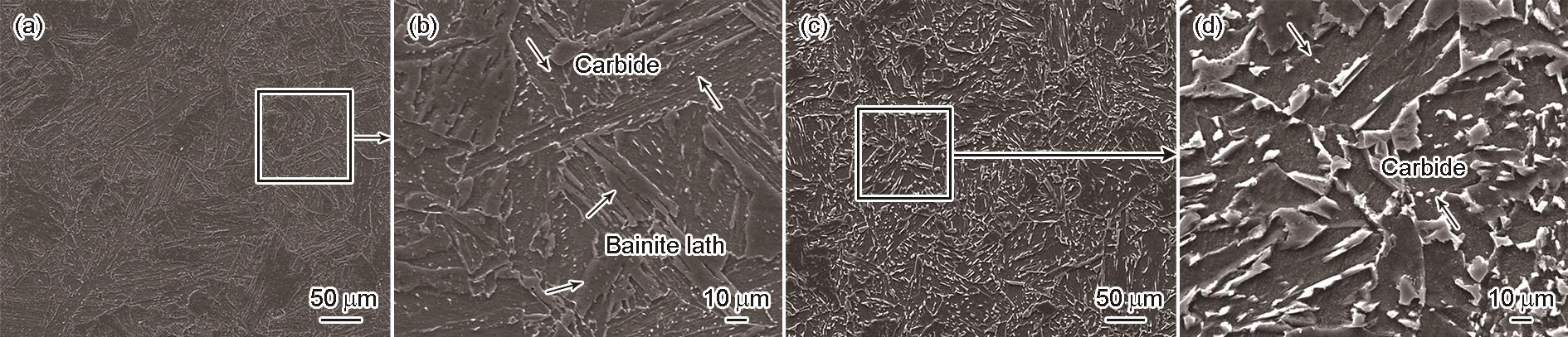 Fig.1 Microstructures of Sb-free steel (a, b) and Sb-added steel (c, d) |