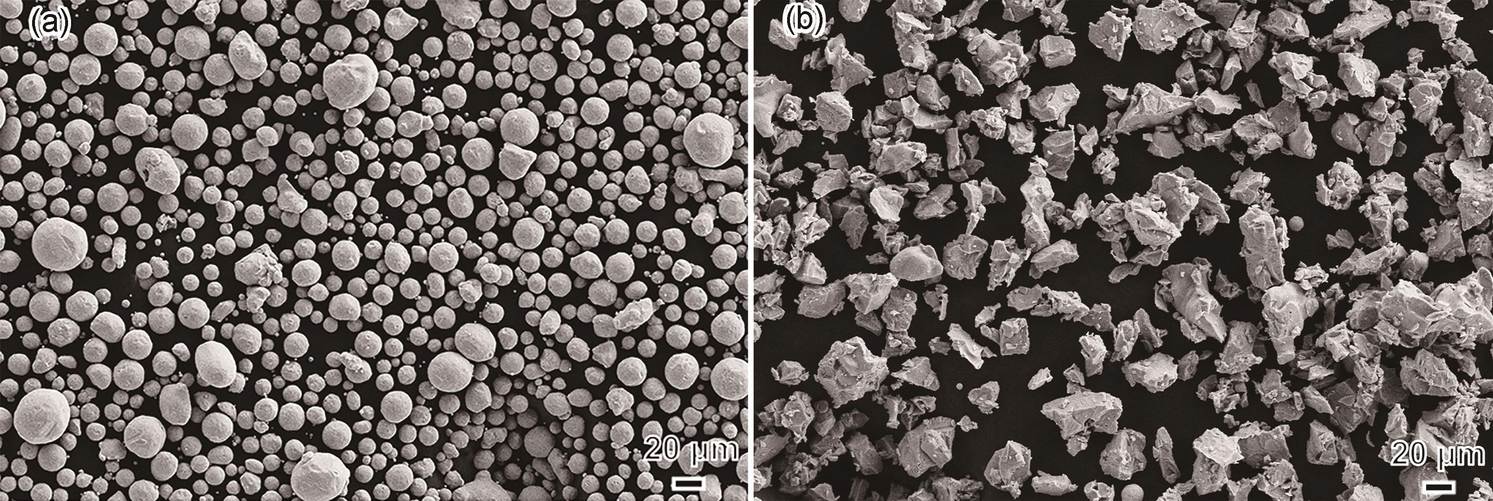 Fig.1 Morphologies of TUP2 (a) and TA2 (b) powders used in cold spraying |