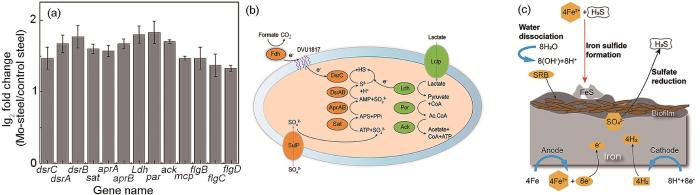 Schematic illustrations of molecular mechanism about the effect of Mo on the adhesion and corrosion of D.vulgaris on Ms: (a) gene diagram; (b) S2- synthesis related enzymes; (c) corrosion process
