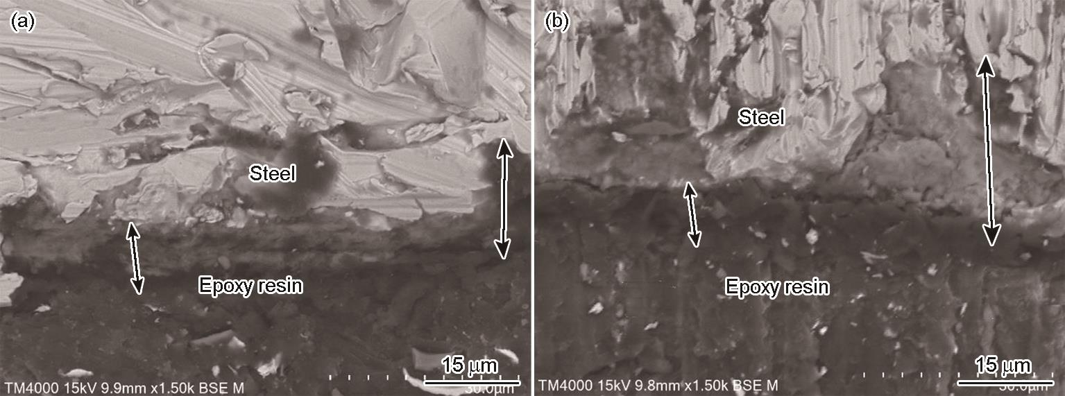 | Fig.4 SEM cross-sectional images of Cs (a) and Ms (b) after 14 d immersion in biotic medium |