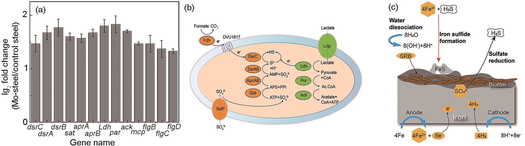 | Fig.12 Schematic illustrations of molecular mechanism about the effect of Mo on the adhesion and corrosion of D.vulgaris on Ms: (a) gene diagram; (b) S2- synthesis related enzymes; (c) corrosion process |