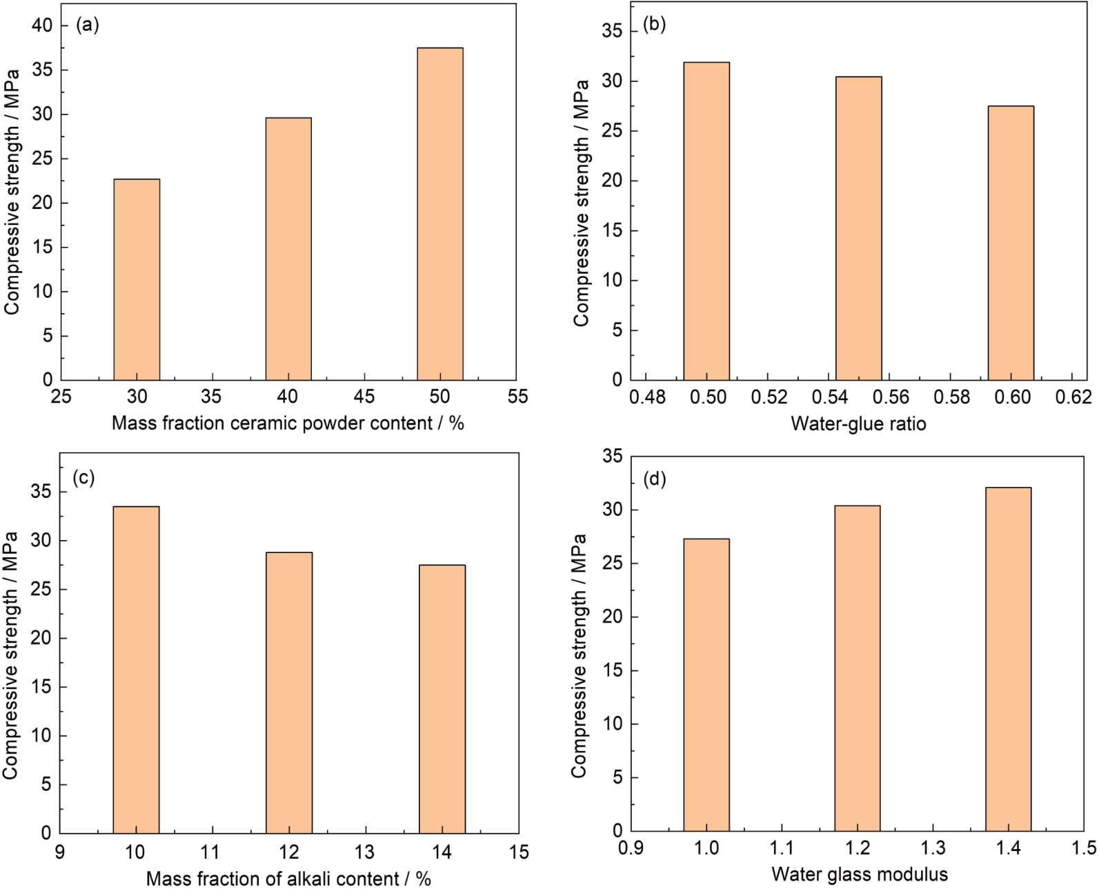 | Fig.3 Compressive strengths of test blocks with different ceramic powder contents (a), water-binder ratios (b), alkali con-tents (c) and moduli (d) |