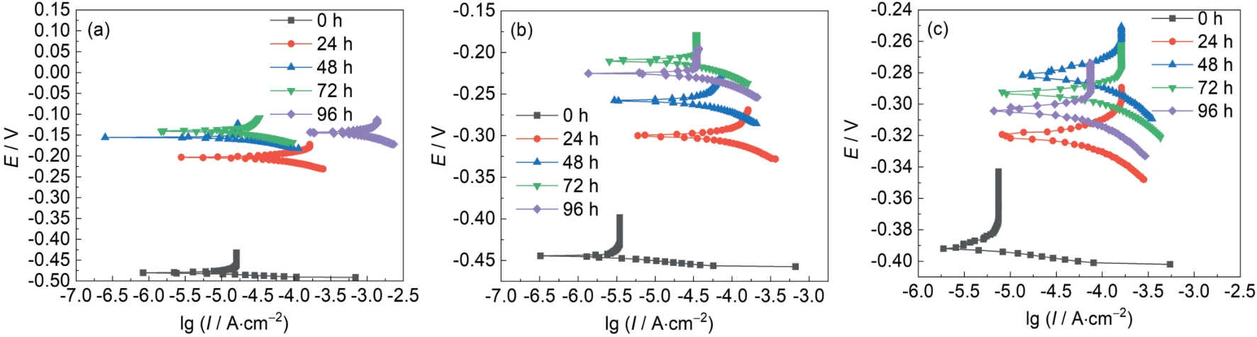 | Fig.12 Tafel polarization curves of test blocks with ceramic powder contents of 30% (a), 40% (b) and 50% (c) after electro-lytic accelerated corrosion for different time |