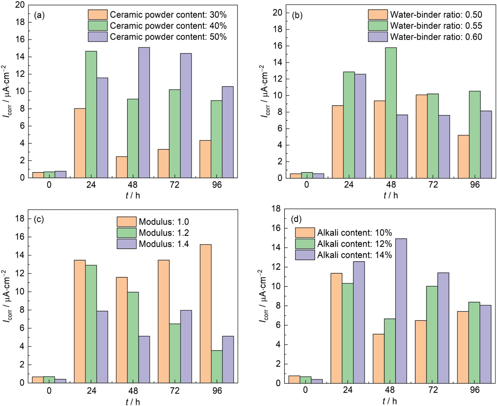 | 图13 不同陶瓷粉掺量、水胶比、模数及碱掺量试块的腐蚀电流密度 |