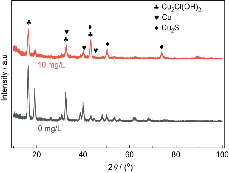 Fig.6 XRD patterns of Cu-15Ni-8Sn alloy after 30 d immersion in 3.5%NaCl solutions containing 0 mg/L and 10 mg/L Na2S |