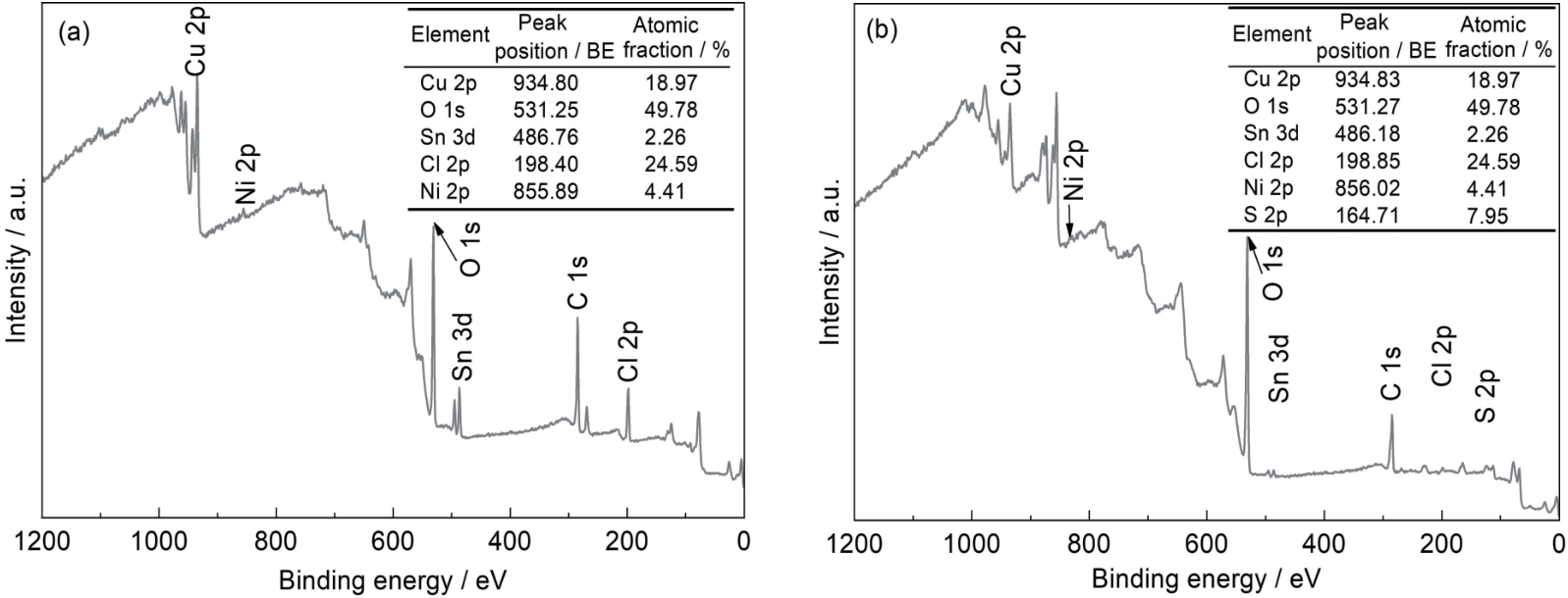 Fig.7 XPS full spectra of Cu-15Ni-8Sn alloy after 30 d immersion in 3.5%NaCl solutions containing 0 mg/L (a) and 10 mg/L (b) Na2S |