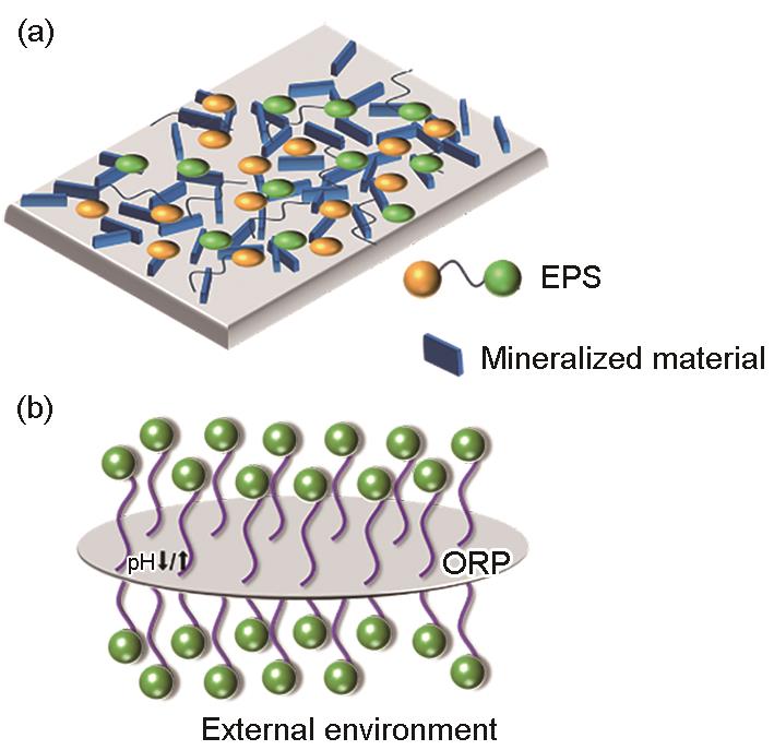 | Fig.2 Schematic diagram of the mechanism of microbial mineralization in corrosion protection: (a) microorganisms form dense biomineralization layers, (b) microorganisms alter environmental conditions that affect corrosion |
