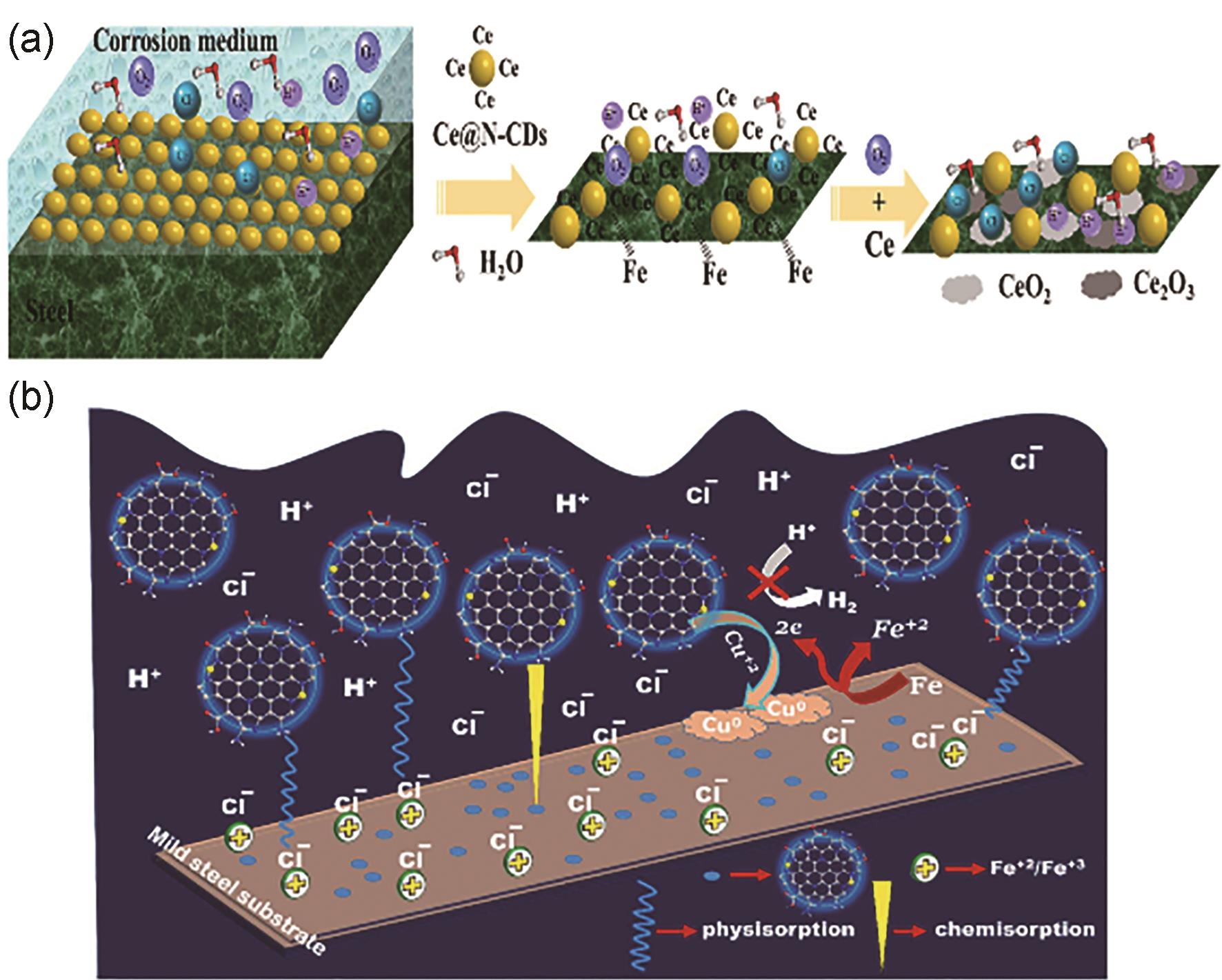 | Fig.9 Corrosion inhibition mechanism diagram of Ce@N-CDs inhibitor on steel in acidic solution (a), and the corrosion inhibition mechanism diagram of Cu,N-CDs inhibitor on mild steel in acidic solution (b)[ |