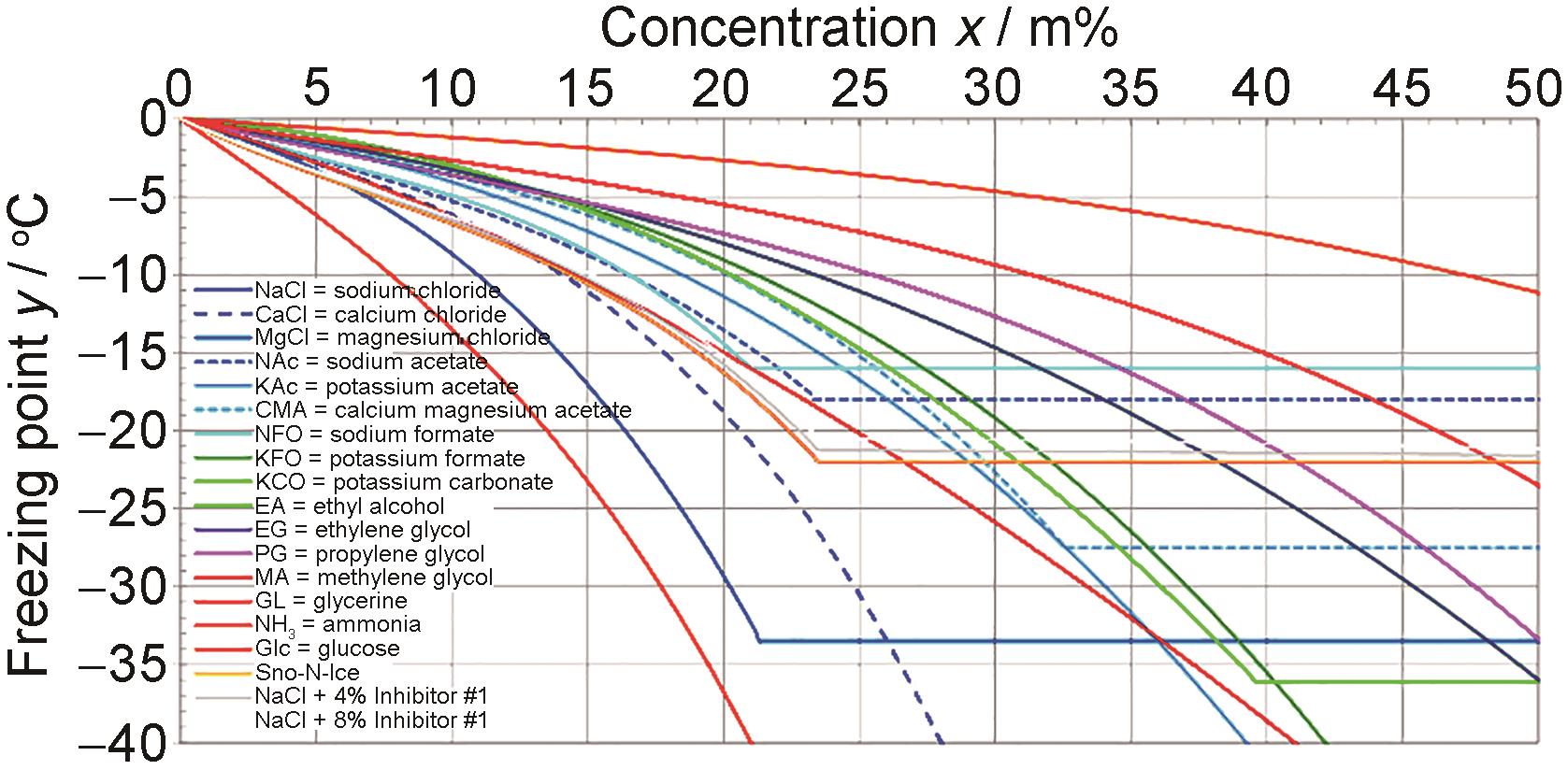 | Fig.1 Relationships between freezing points and concentrations for common snow melting agents[ |