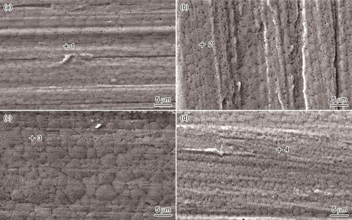 图2呈现了试样在不同水含量前驱体溶液中经液相氟化处理后的表面微观形貌。由图1a~1d可知,经不同水含量前驱体溶液液相氟化处理后,试样表面整体较为平整。当前驱体水含量较低时(图2a和2b),试样表面仍可见砂纸打磨痕迹。随水含量增加(图2c和2d),由于溶液粘度降低,F-侵蚀能力增强,对试样的溶解性增强,致使试样表面划痕结构消失。由表1中点1至4的EDS数据可知,试样表面检测到的信号除了来自基体的Ti、Al和Nb及较低的O,还包括F,鉴于试样在溶剂热处理后经过了彻底冲洗,可认为液相处理过程中F参与了试样表面的反应。此外,经液相氟化处理后的试样表面均可见密集分布的纳米级孔洞,且随水含量增加,这些纳米孔洞的密度亦随之增加,这一结构在先前的研究中已有报道[38],主要是由于液相氟化过程中气态氟化物的形成导致。