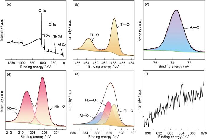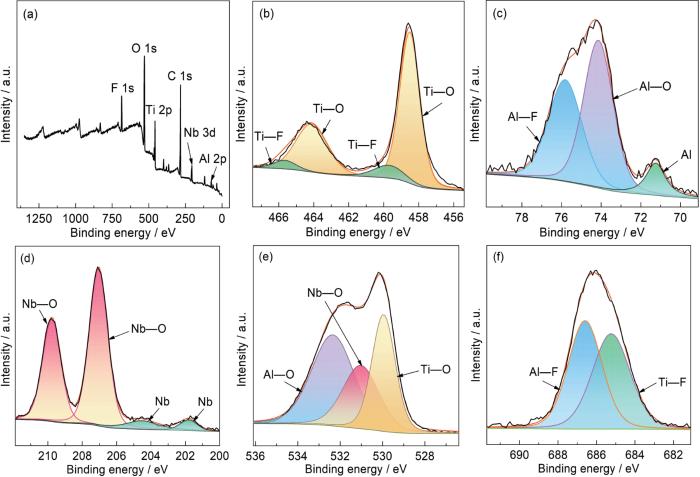 XPS full spectrum (a) and high-resolution spectra of Ti 2p (b), Al 2p (c), Nb 3d (d), O 1s (e), and F 1s (f) for Ti45Al8.5Nb alloy after liquid-phase fluorination in anhydrous NH4F-ethylene glycol solution