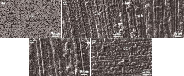 图9为各组试样经900 ℃氧化100 h后样品表面SEM图像。如图9a所示,未经处理的试样在氧化后表面呈现出均匀的柱状晶结构。根据表2中点1的能谱扫描结果及图8a中XRD图谱可知裸样表面柱状晶结构的主要成分为TiO2,这一结果进一步说明裸合金在高温氧化后发生了较为明显的氧化。Liu等[5]和Zeller等[45]也观察到TiAl合金经高温氧化后出现这种柱状晶结构,这一结构的形成主要是由于高温氧化过程中TiO2倾向于沿特定晶向生长,该结构的氧化层与基体间的粘附性较差。相比而言,经液相氟化处理的试样(图9b~d)在高温氧化后表面氧化层结构更致密,并呈现出褶皱状的形貌,结合表2中点2~5的EDS分析结果及XRD图谱可知,这些褶皱状形貌主要成分为Al2O3,表明试样表面形成了一层致密的Al2O3保护层,可有效阻止氧向基体内部发生扩散,进而提升合金的抗高温氧化性能。