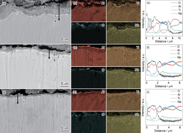 Cross-sectional BSE images, corresponding EDS elements mappings and line scannings of Ti45Al8.5Nb alloy untreated (a-c) and pre-fluorinated in NH4F-ethylene glycol solutions containing 0% (d-f) and 3% (g-i) H2O after oxidation at 900 oC for 100 h
