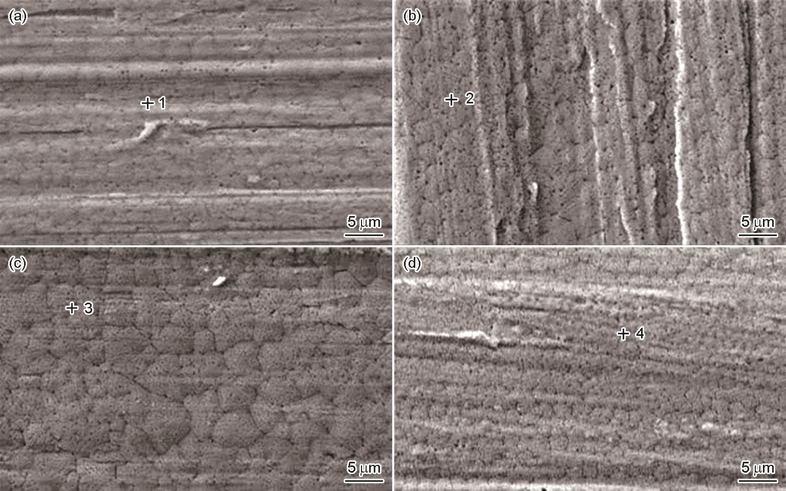| Fig.2 Surface morphologies of Ti45Al8.5Nb alloy after liquid-phase fluorination in NH₄F-ethylene glycol solutions containing 0% (a), 1% (b), 3% (c) and 5% (d) H2O |