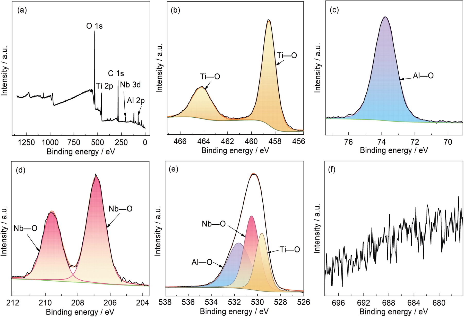 | Fig.6 XPS full spectrum (a) and high-resolution spectra of Ti 2p (b), Al 2p (c), Nb 3d (d), O 1s (e), and F 1s (f) for Ti45Al8.5Nb alloy pre-fluorinated in anhydrous NH4F-ethylene glycol solution after oxidation at 900 oC for 100 h |