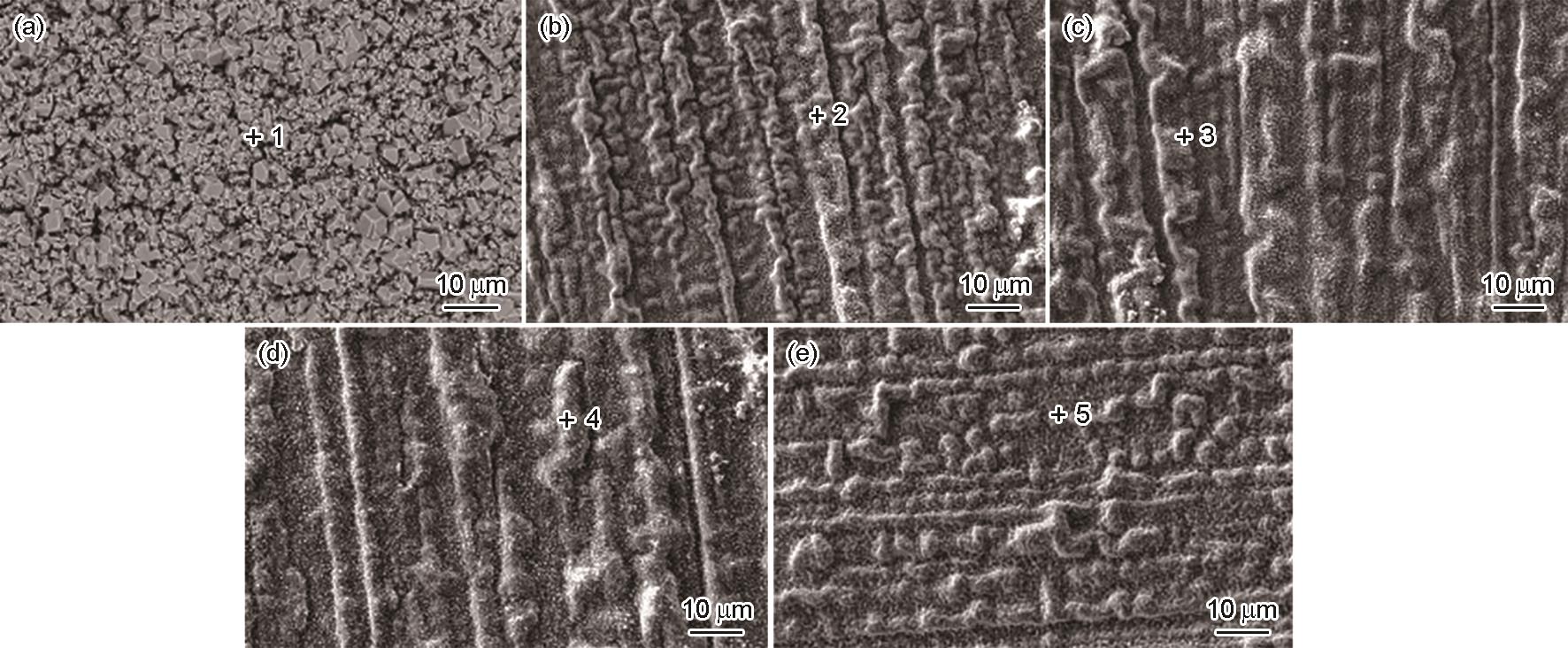 | Fig.9 Surface morphologies of Ti45Al8.5Nb alloy untreated (a) and pre-fluorinated in NH4F-ethylene glycol solutions containing 0% (b), 1% (c), 3% (d), 5% (e) H2O after oxidation at 900 oC for 100 h |