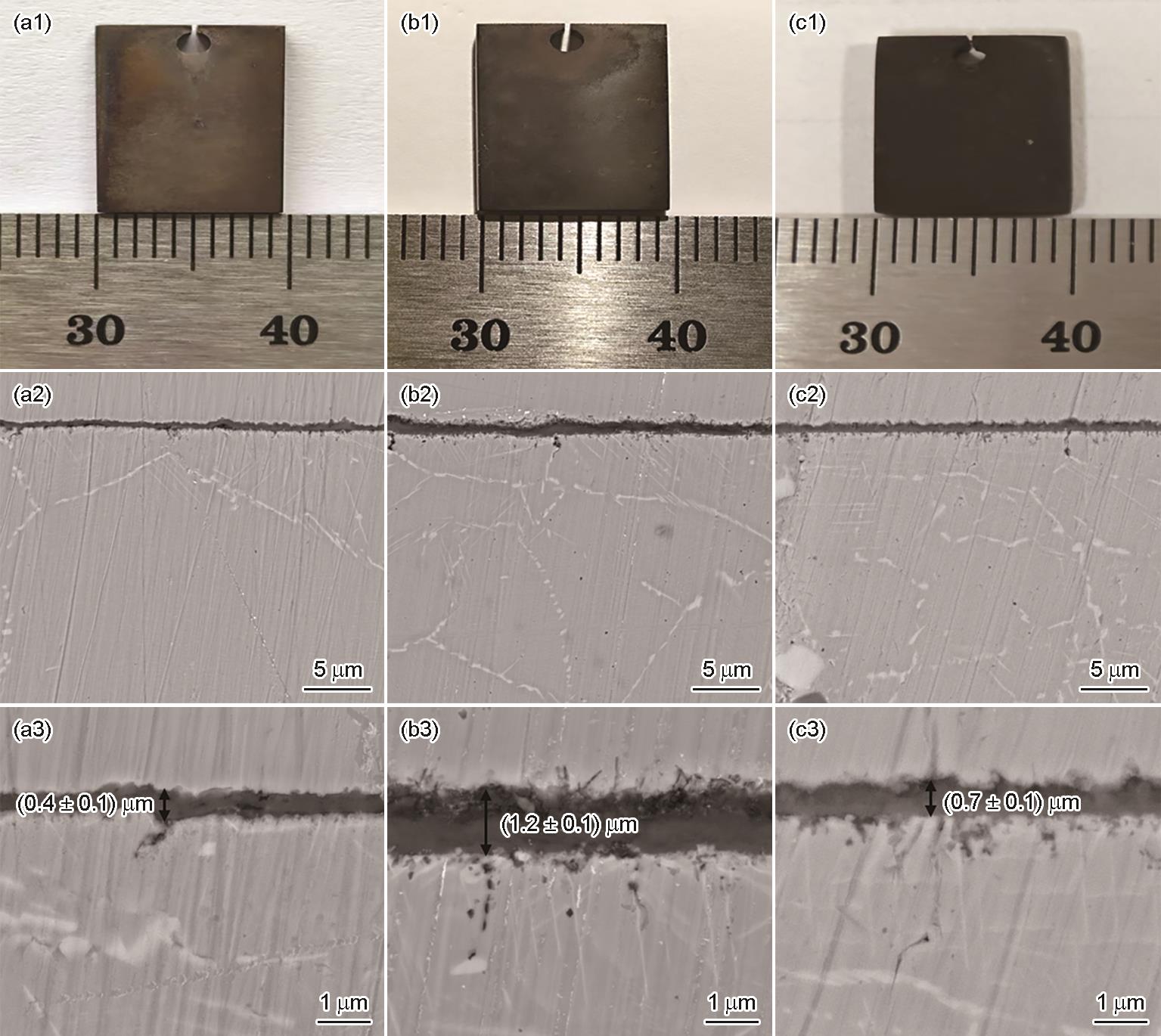 | Fig.4 Macroscopic and cross-sectional morphologies of Inconel 718 alloy without salt deposits after 500 h oxidation in air (a1-a3), CO2 (b1-b3), CO2-30%H2O (c1-c3) |
