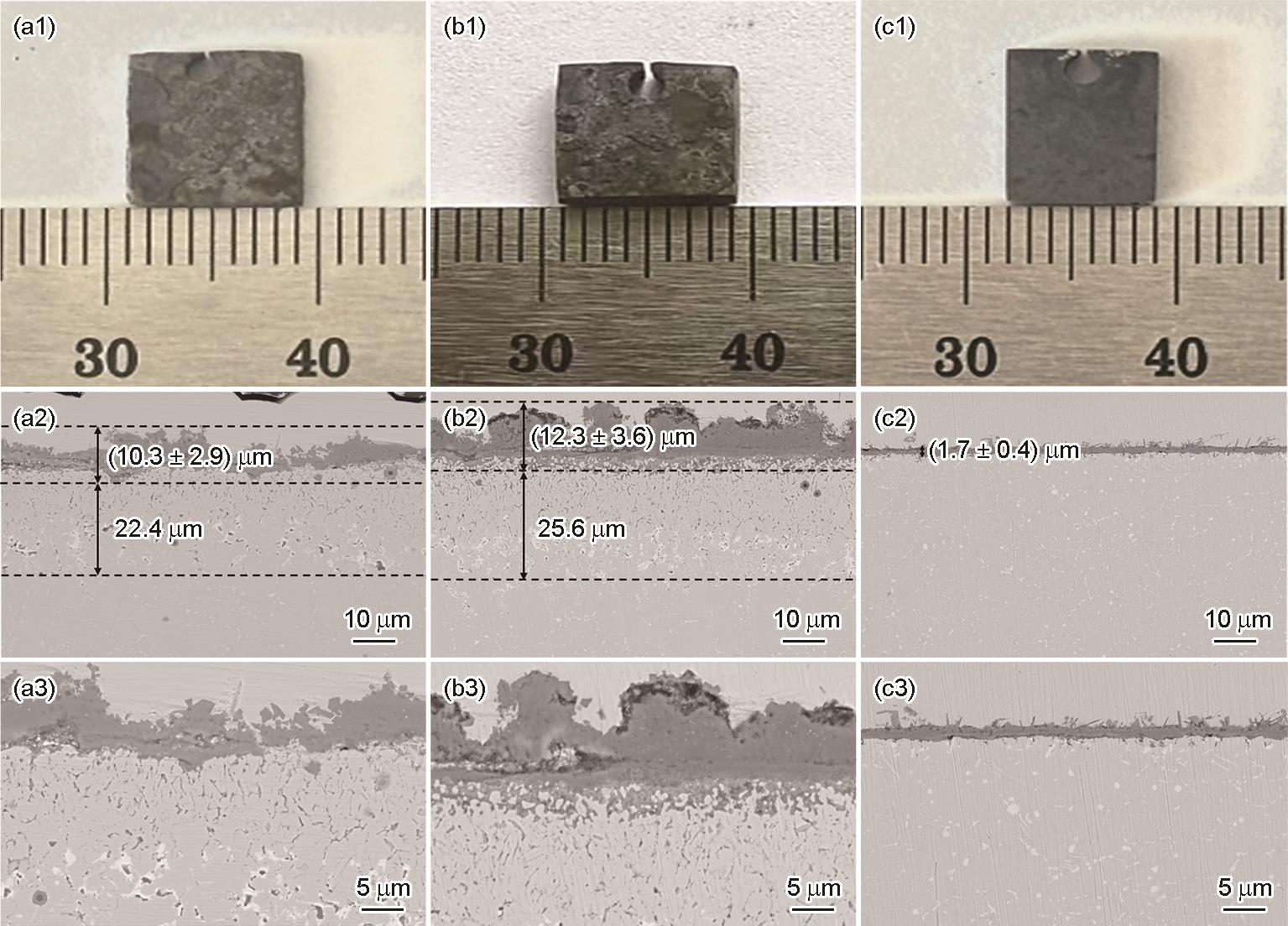 | Fig.6 Macroscopic and cross-sectional morphologies of Inconel 718 alloy with salt deposits after 100 h corrosion in air (a1-a3), air-30%H2O (b1-b3) and CO2-30%H2O (c1-c3) |