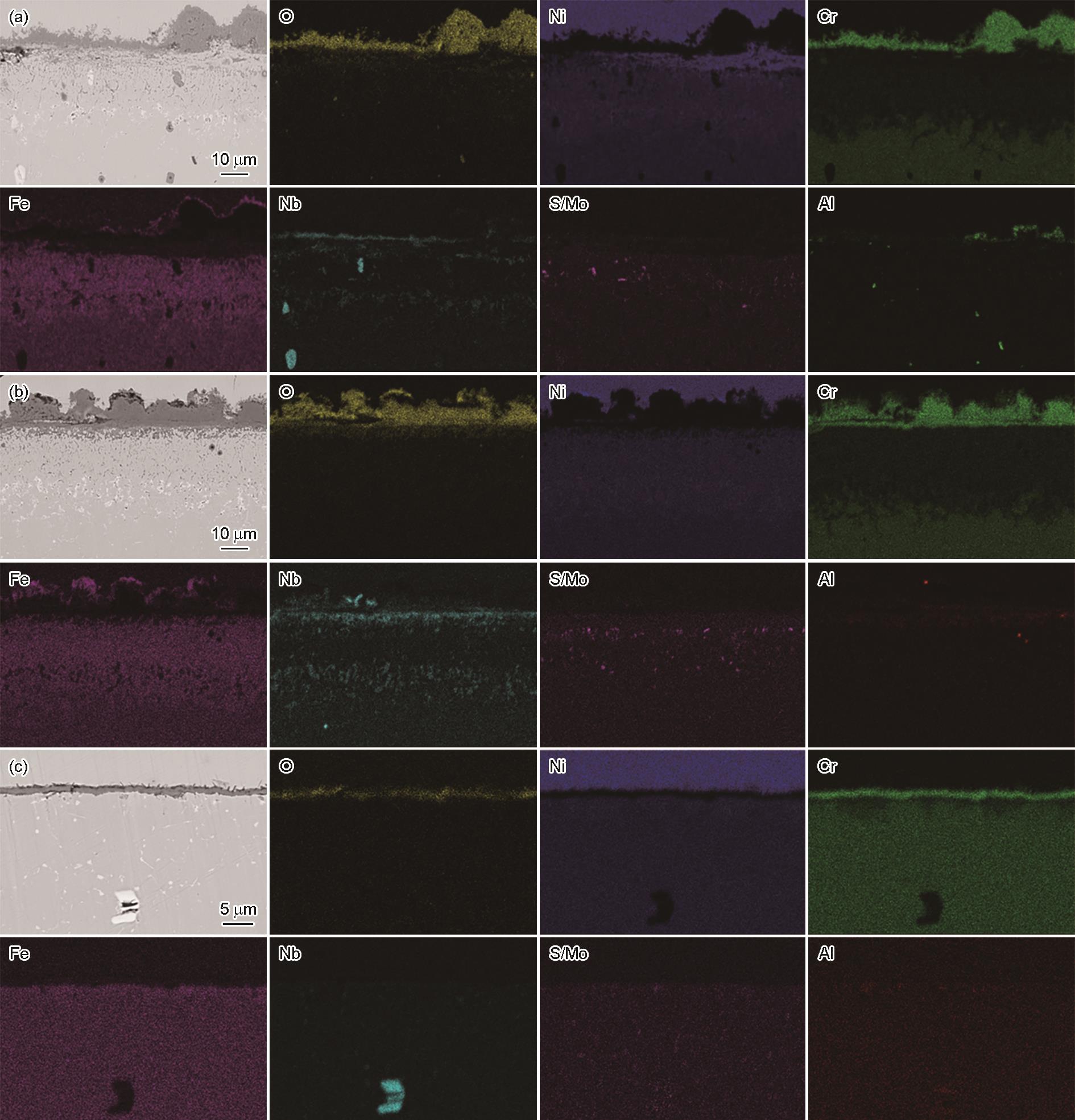 | 图7 Inconel 718合金涂盐后在不同气氛中腐蚀100 h后的元素EDS面分布 |