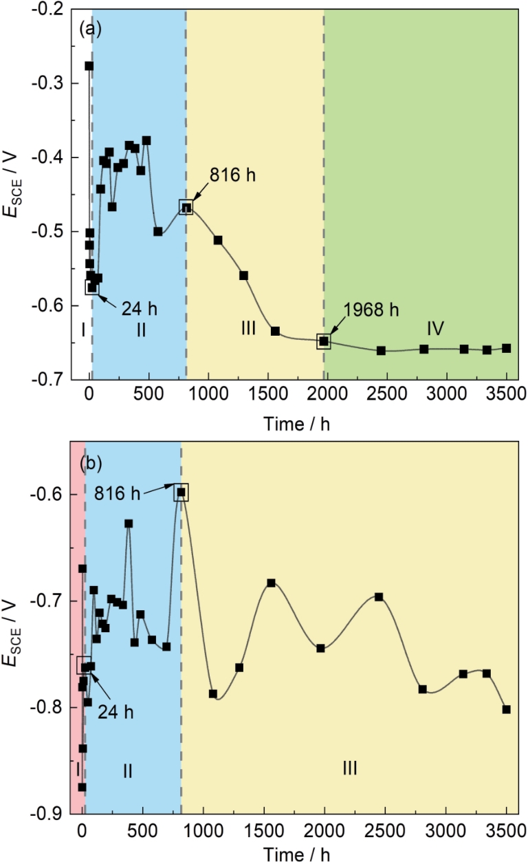 | Fig.2 OCP curve of epoxy-coated 10# steel (a) and LY12 Al-alloy (b) with immersion time |