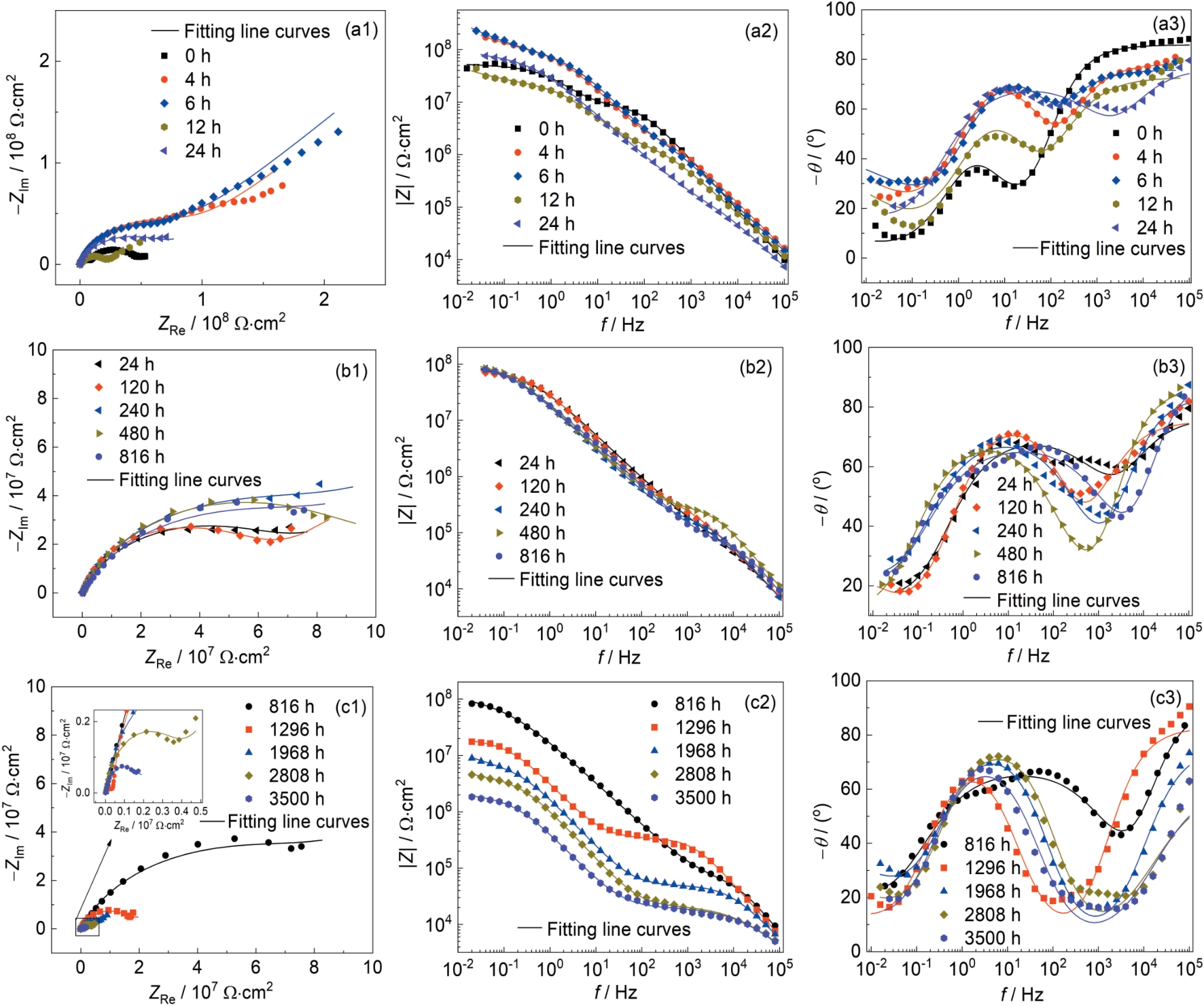 | Fig.4 Nyquist (a1-c1), modules (a2-c2) and phase angle (a3-c3) of the three stages of coated LY12 Al-alloy surface: stage I (0-24 h), stage II (24-816 h), stage III (816-3500 h) |