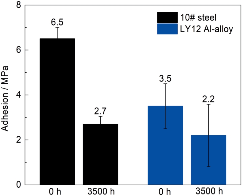 | 图9 10#钢和LY12铝合金浸泡3500 h前后附着力的测试结果 |