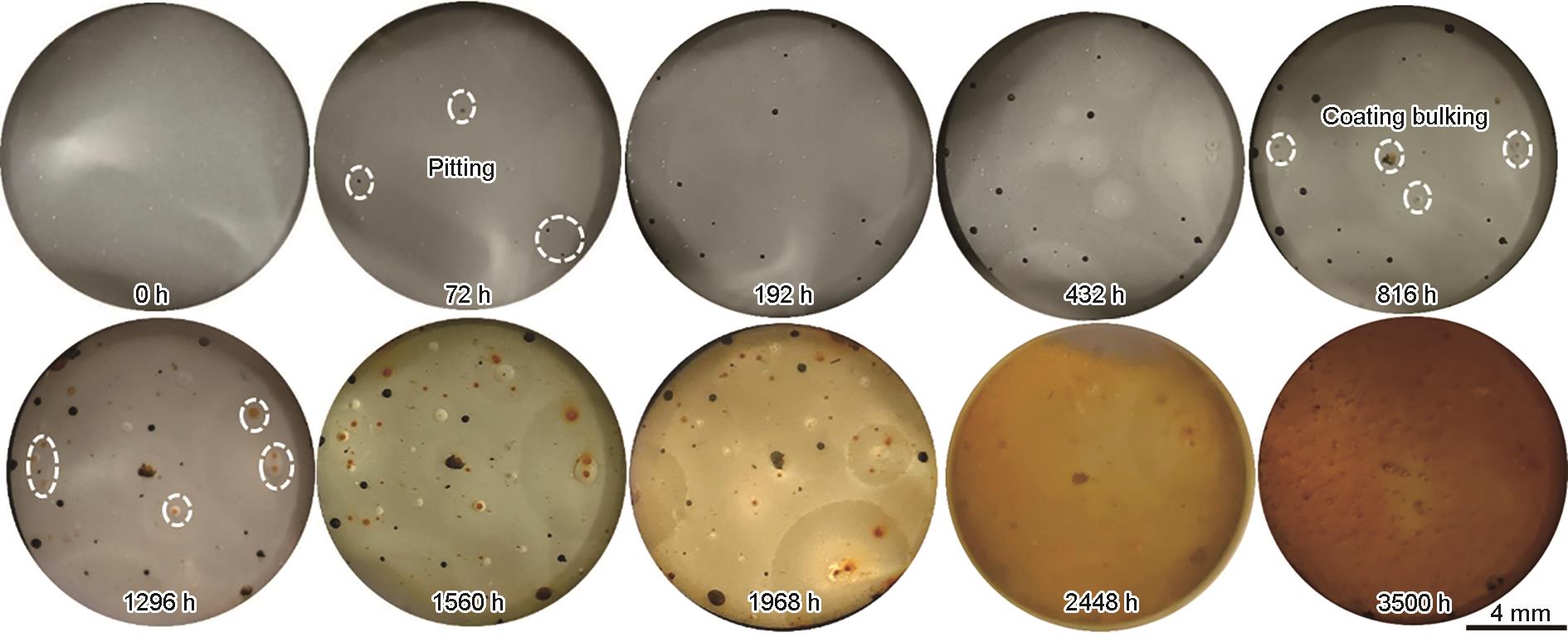 | 图11 涂覆涂层的10#钢浸泡3500 h过程中的宏观形貌演变 |