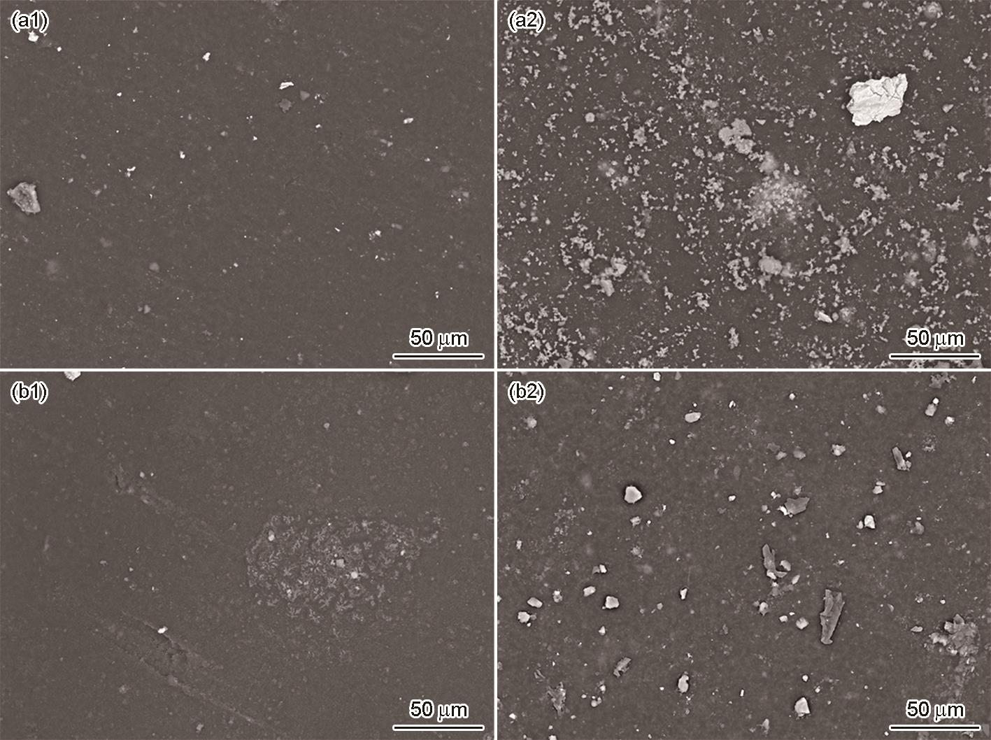 | Fig.14 Microscopic morphologies of epoxy-coated 10# steel (a) and LY12 Al-alloy (b) before (a1, b1) and after immersion for 3500 h (a2, b2) |