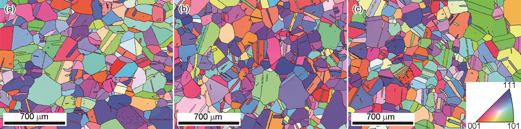 | Fig.1 EBSD grain orientation distribution maps of AFA steel with different Al content after solution treatment at 1250 oC: (a) Q1, (b) Q2, (c) Q3 |
