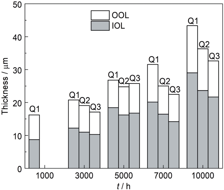 | 图9 不同Al含量的AFA钢在600 ℃静态饱和氧LBE环境中氧化层厚度与腐蚀时间的关系 |