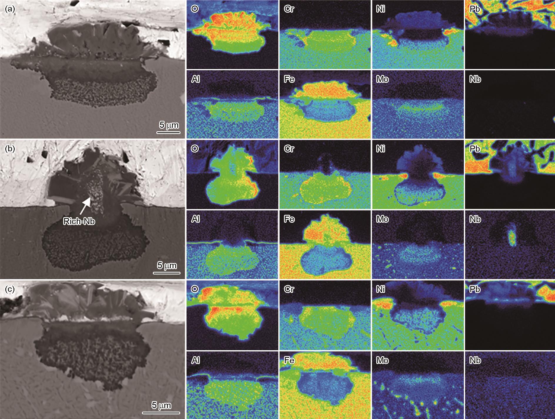 | 图11 不同Al含量的AFA钢在600 ℃静态饱和氧LBE环境中腐蚀3000 h后氧化区的截面EPMA图像和对应的元素分布 |