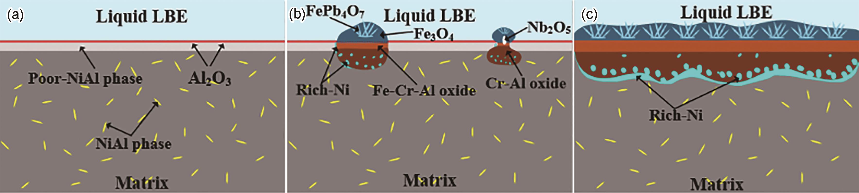 | Fig.13 Schematic diagram of oxidation corrosion mechanism of alloy in static saturated oxygen LBE environment at 600 oC: (a) short-term corrosion, (b) intermediate corrosion, (c) long-term corrosion |