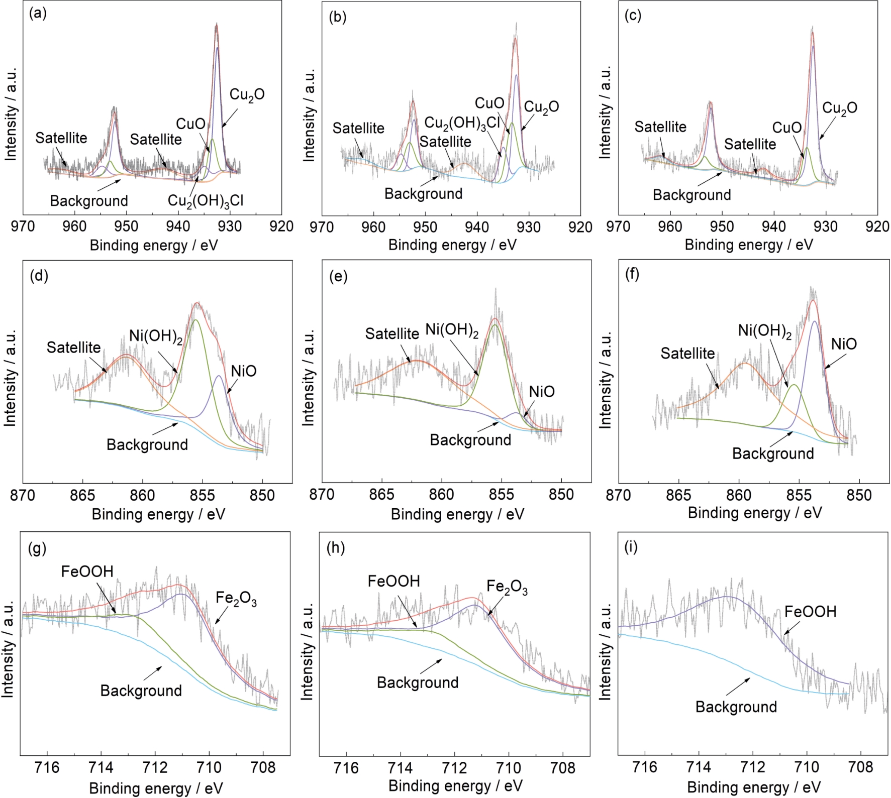 | Fig.3 XPS fine peaks of Cu 2p (a-c), Ni 2p3/2 (d-f) and Fe 2p3/2 (g-i) on the surfaces of A sample (a, d, g), B sample (b, e, h) and C sample (c, f, i) after immersion in seawater for 60 d |