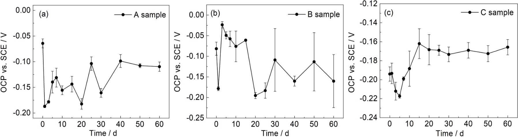 | Fig.5 Open-circuit potential vs. time curves of A sample (a), B sample (b) and C sample (c) immersed in seawater for 60 d |