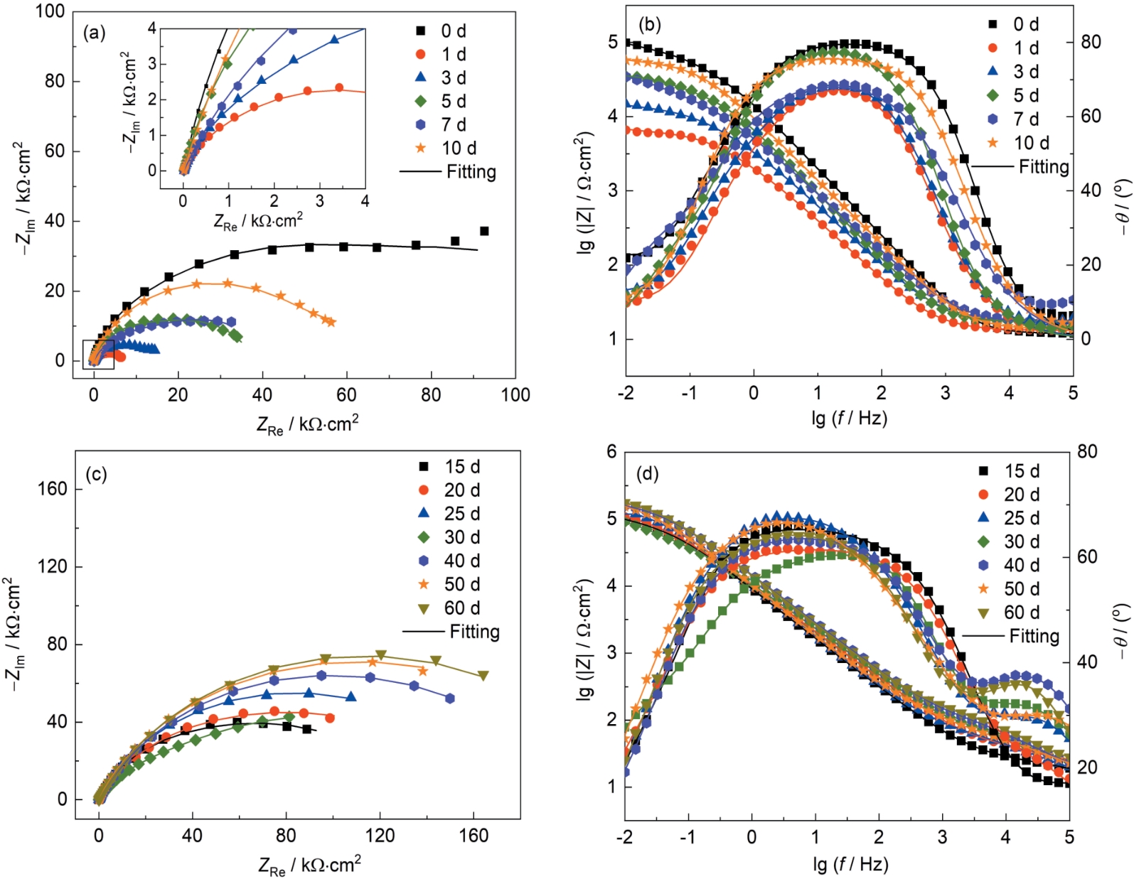 | Fig.6 Nyquist (a, c) and Bode (b, d) plots EIS of A sample immersed in seawater for 60 d |