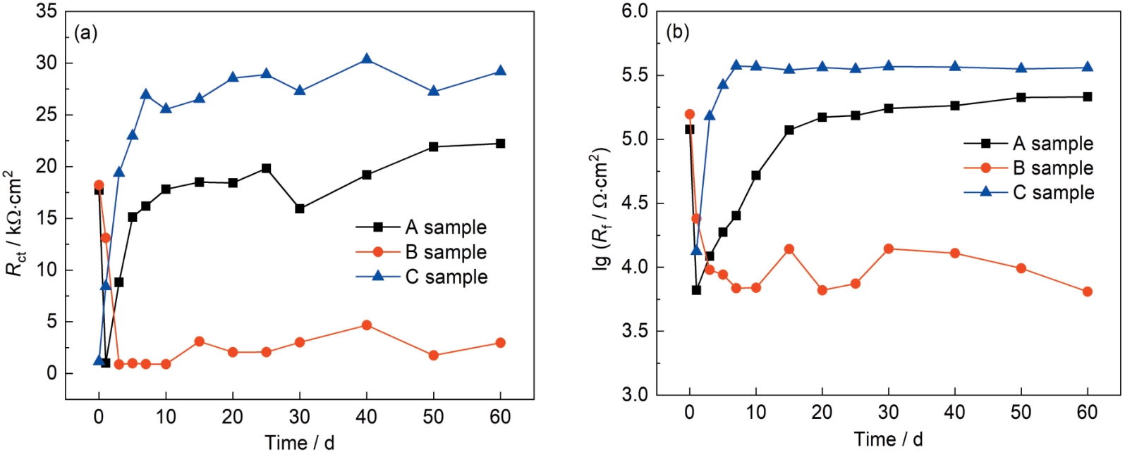 | Fig.10 Variations of Rct (a) and Rf (b) of A, B and C samples in seawater with immersion time |