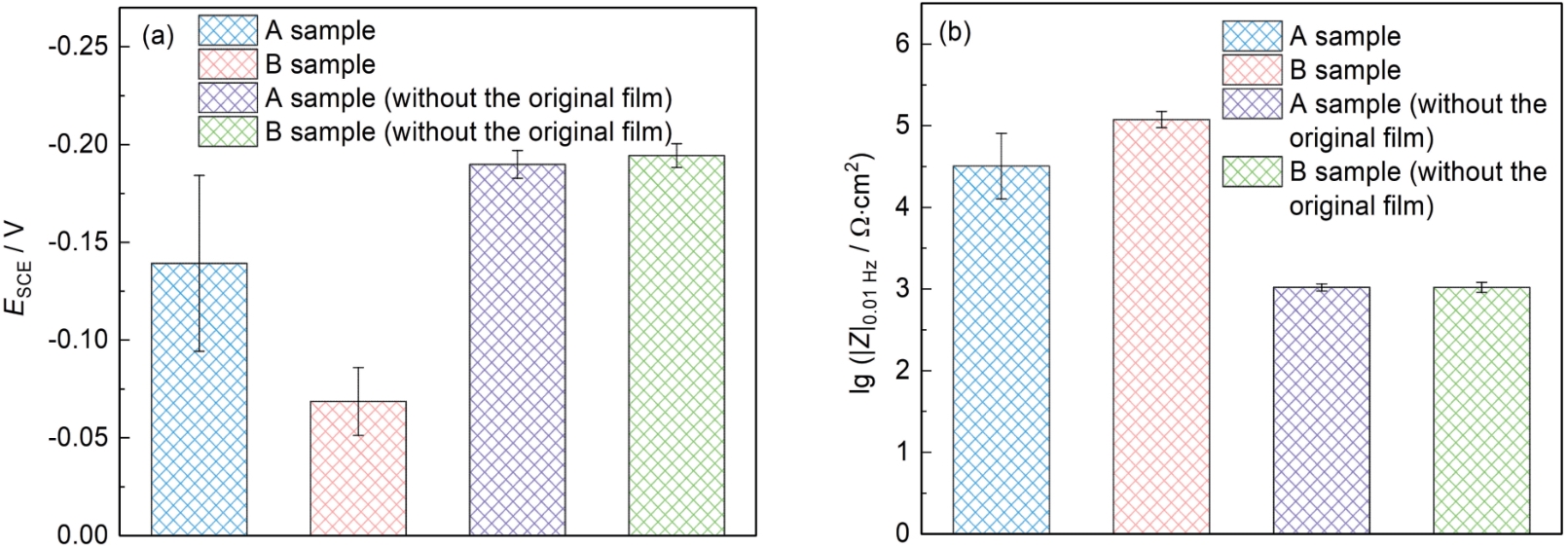 | Fig.15 Open circuit potentials (a) and lg |Z|0.01 Hz values (b) of A and B samples with and without the original corrosion films after immersion in seawater for 30 min |