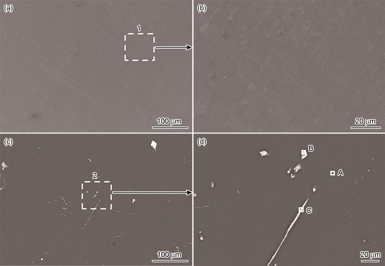 | Fig.1 Backscattering photographs of pure Mg and AZ31 Mg-alloy samples: (a, b) pure Mg samples, (b) morphology with high magnification of region 1, (c) AZ31 Mg-alloy samples, (d) morphology with high magnification of region 2 |