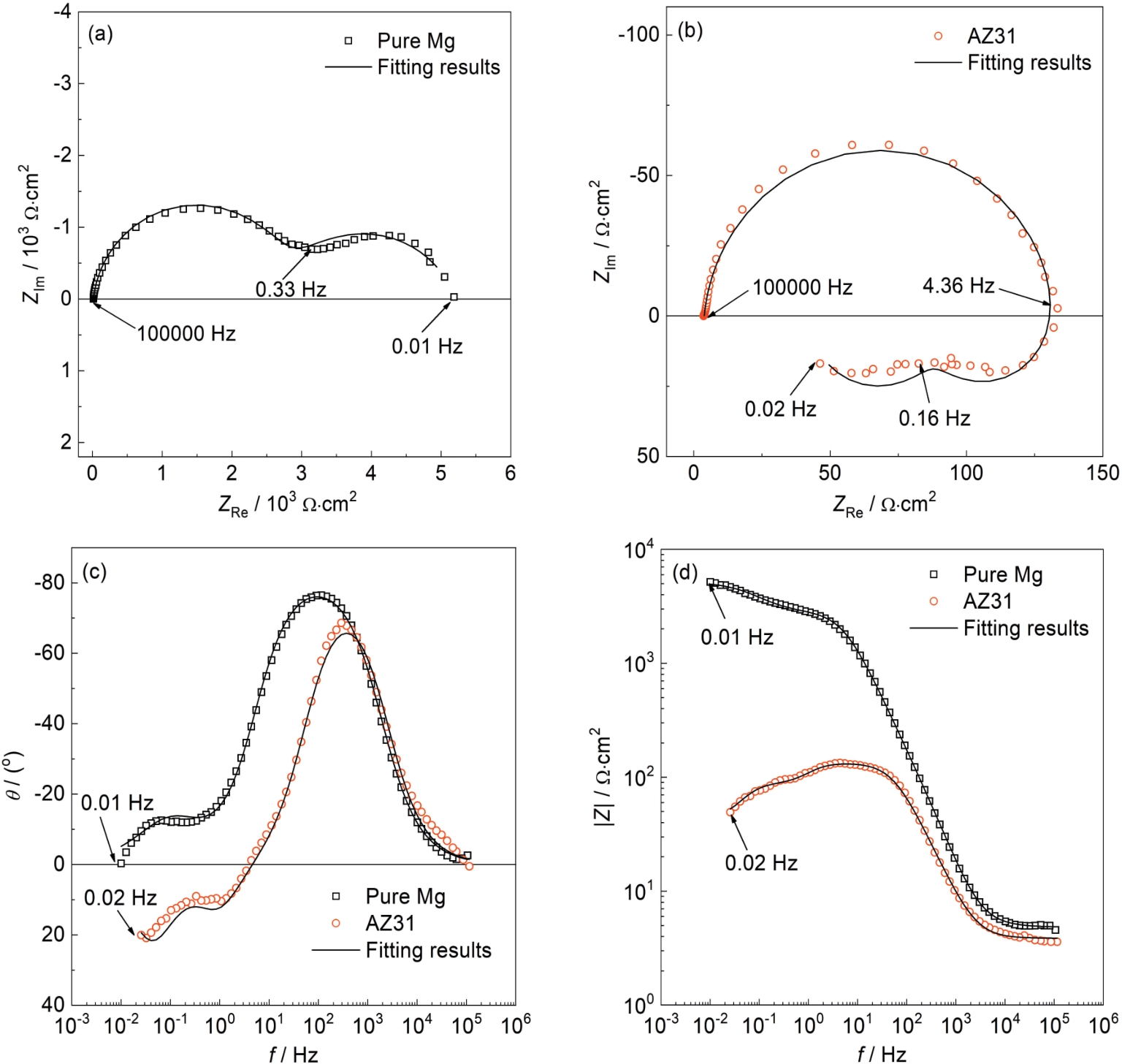 | Fig.2 EIS results of pure Mg and AZ31 Mg-alloy samples after immersion in 3.5%NaCl solution for 24 h: (a) Nyquist plot of pure Mg samples, (b) Nyquist plot of AZ31 Mg-alloy samples, (c) frequency-phase angle plot, (d) frequency-modulus plot |