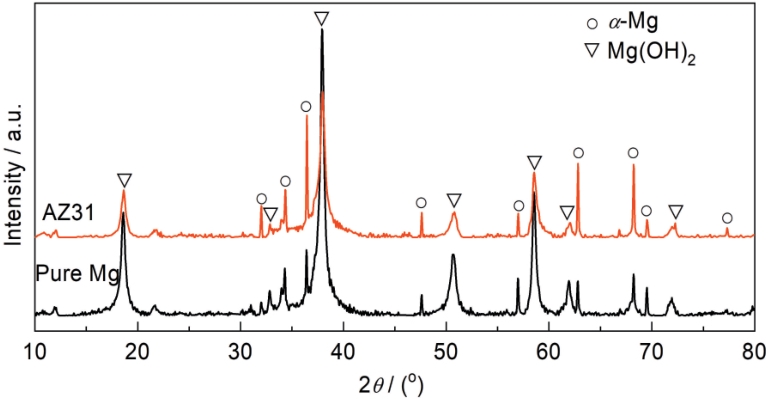 | 图7 纯镁和AZ31镁合金腐蚀产物XRD谱 |