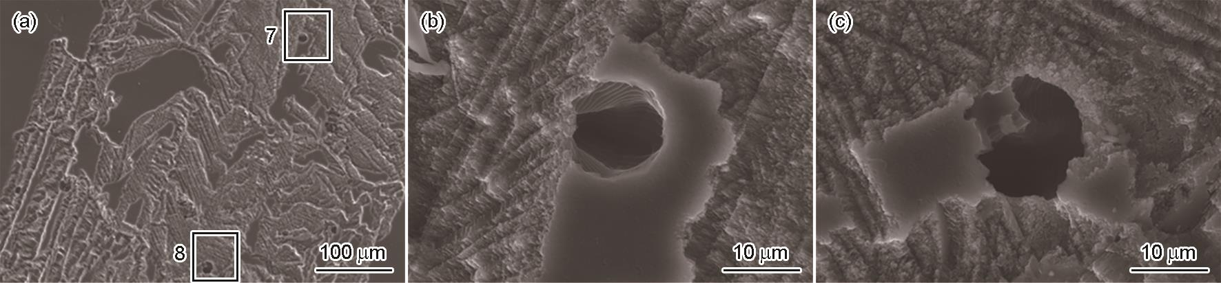| Fig.10 SEM of corrosion morphology of AZ31 Mg-alloy samples after 30 min immersion: (a) AZ31 Mg-alloy samples after removal of corrosion products, (b) the morphology with high magnification of region 7, (c) the morphology with high magnification of region 8 |