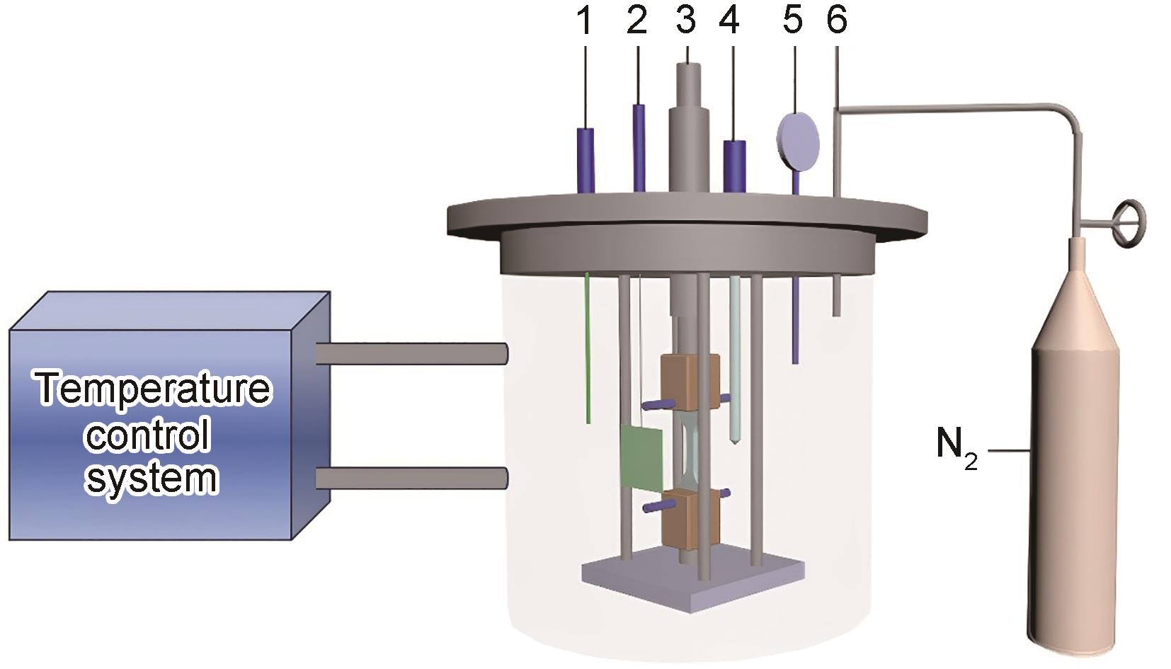 | Fig.1 Schematics of low temperature high pressure SSRT electrochemical system (1-gas inlet, 2- pressure meter, 3-thermocouple, 4- loading rod, 5- counter electrode,6- reference electrode) |