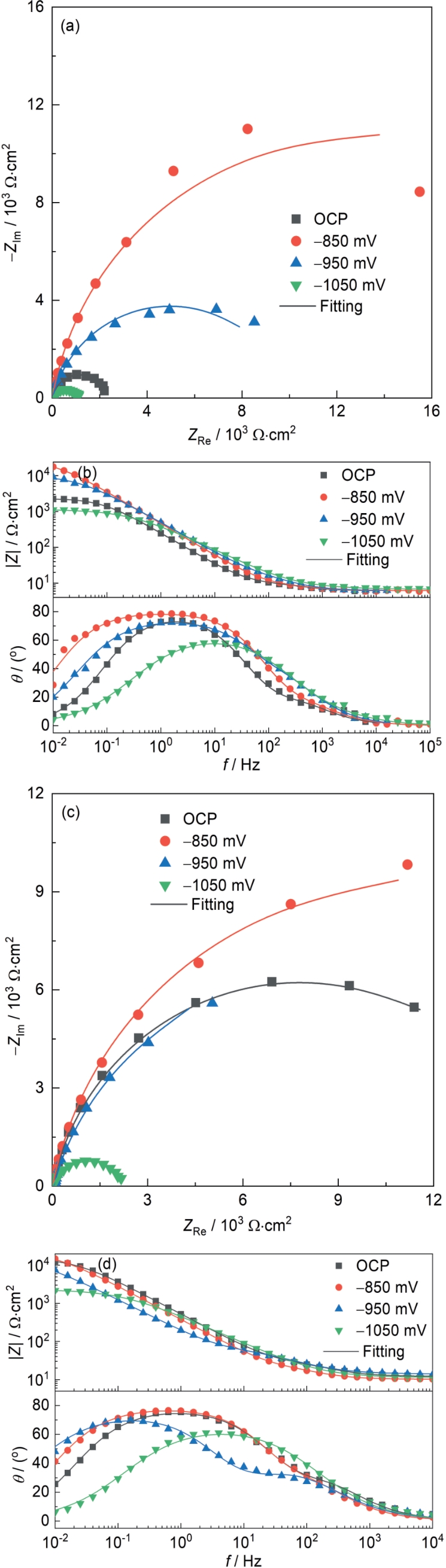| Fig.5 Nyquist (a, c) and Bode (b, d) plots of 10CrNi5-MoV steel at OCP and different cathodic polarization potentials in the simulated shallow-sea (a, b) and deep-sea (c, d) environment |
