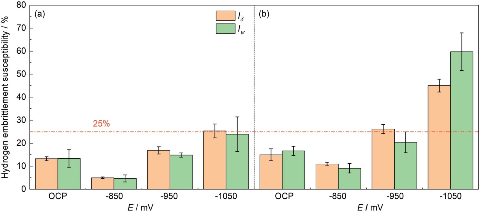 | Fig.9 Hydrogen embrittlement sensitivity of 10CrNi5MoV steel at OCP and different cathodic polarization potentials in the shallow-sea (a) and deep-sea (b) environment |