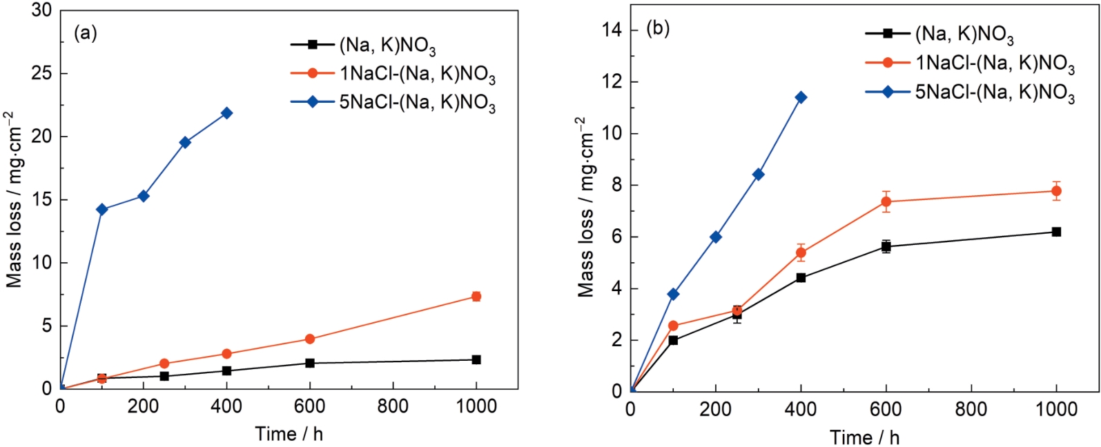NaCl对347H和GH3539在熔融硝酸盐中热腐蚀行为的影响 |