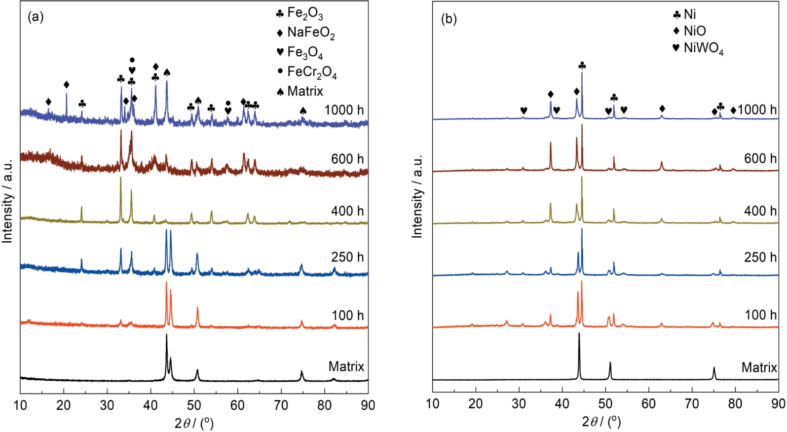 | 图3 347H不锈钢和GH3539合金在600 ℃熔融(Na, K)NO3-1%NaCl中腐蚀不同时间后的表面XRD图谱 |