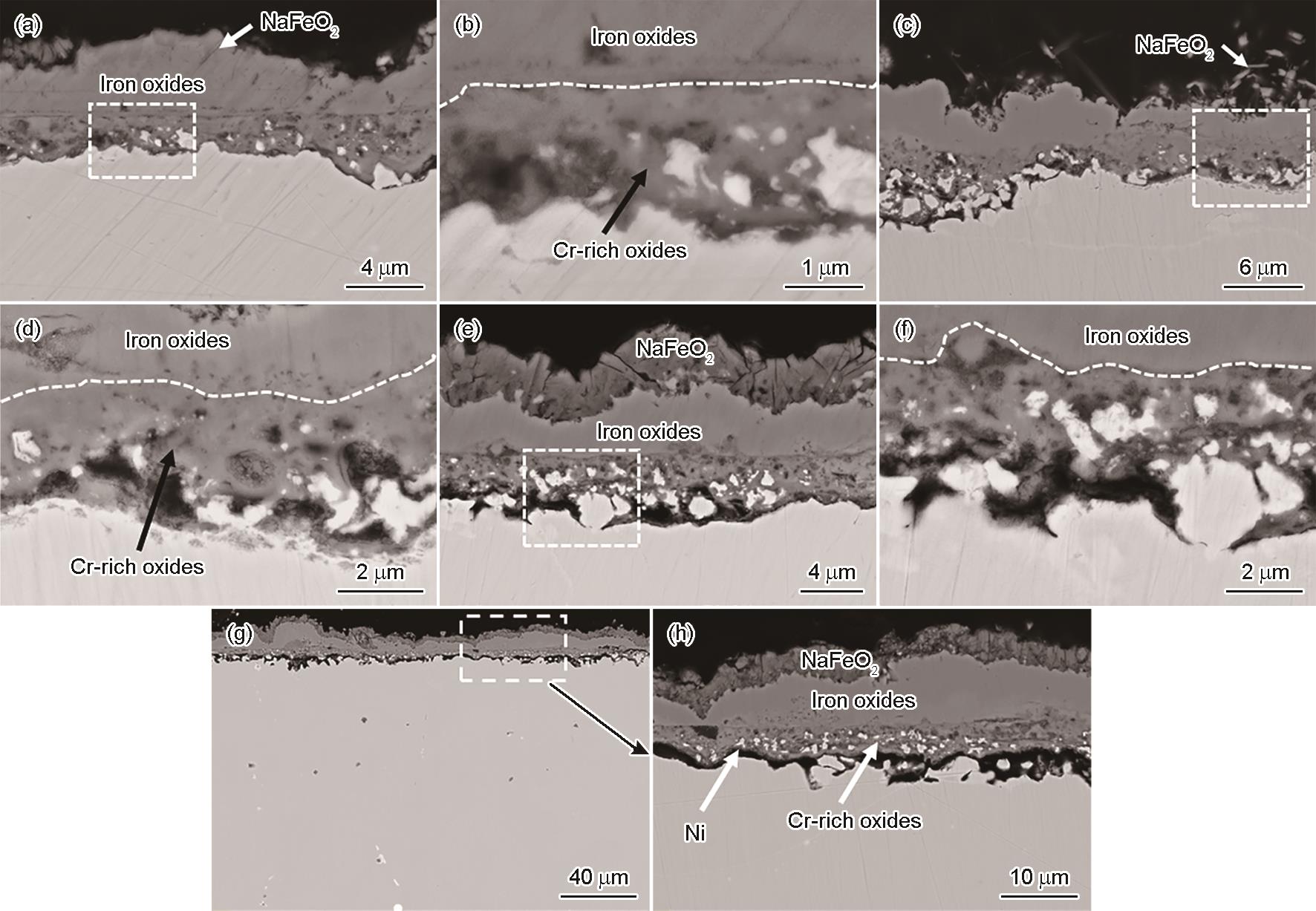 | Fig.6 Cross-sectional morphologies of 347H stainless steel after hot corrosion in molten (Na, K)NO3-1%NaCl at 600 oC for 250 h (a, b), 400 h (c, d), 600 h (e, f) and 1000 h (g, h) |