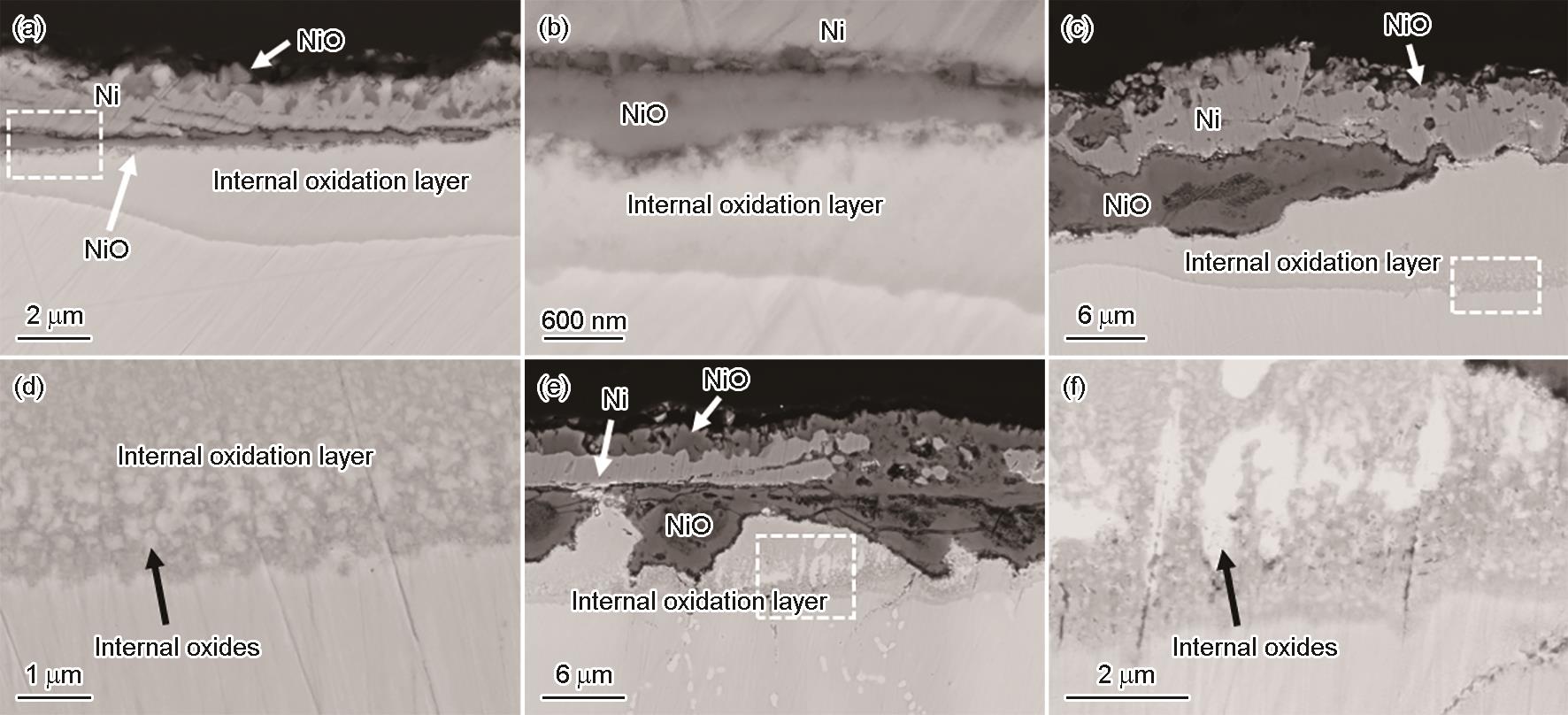 | Fig.9 Cross-sectional morphologies of GH3539 alloy after hot corrosion in molten (Na, K)NO3-1%NaCl at 600 oC for 100 (a,b), 400 (c, d) and 600 (e, f) |