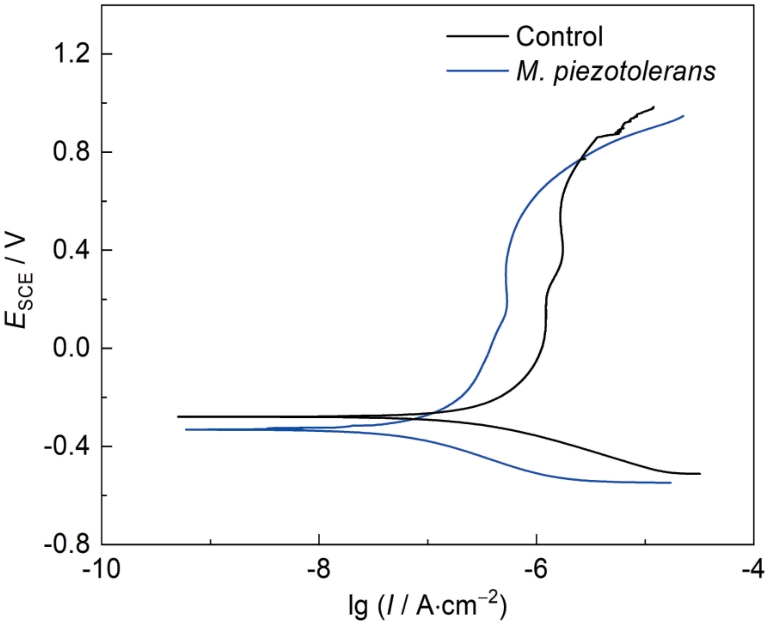 | Fig.6 Polarization curves of 2205 duplex stainless steel after 14 d immersion in sterilization and M. piezotolerans culture |