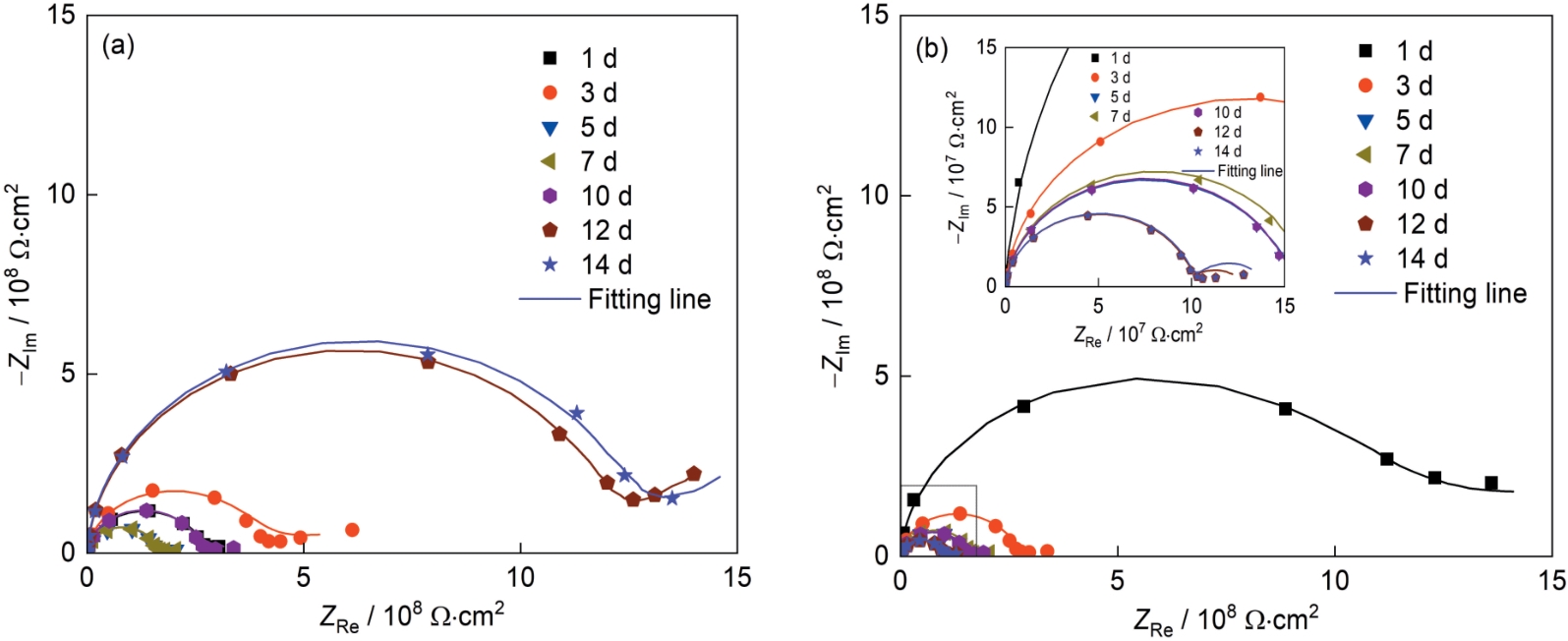 | 图7 2205双相不锈钢在灭菌和有菌介质中浸泡14 d后的电化学阻抗谱 |